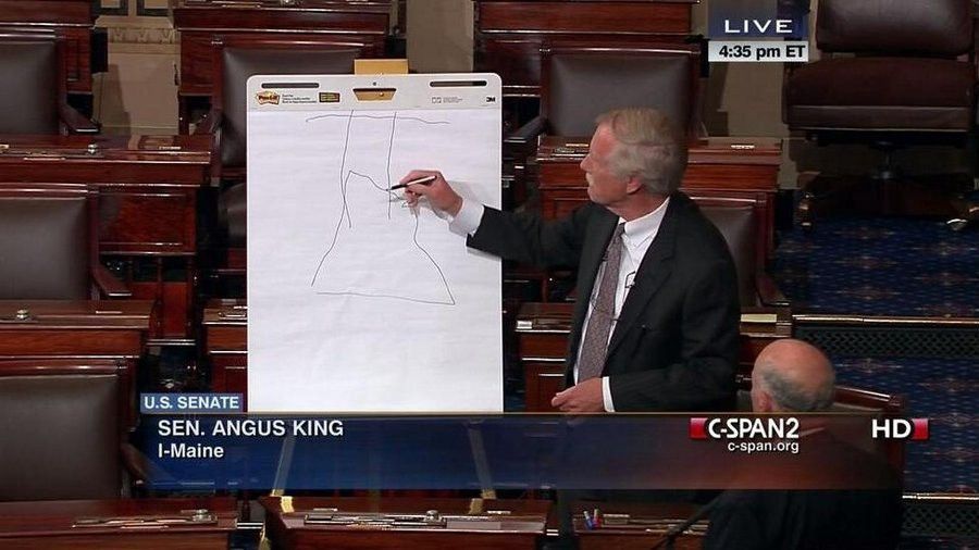 And hey, maybe numbers take too long to write. There’s an old storytelling technique, “show don’t tell.” In this case, Senator Angus King is showing everyone how he puts his shirts (tops?) on every morning — with arms thrown up in the air as if he just doesn’t care. You go, King.