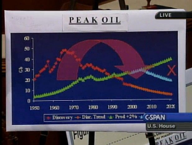 Now if you do have access to powerful data analysis and presentations tools, make sure to go all in. This is a very easy to understand summary of how oil, potentially measured in gigabits, has changed in some way (or ways) across various characteristics of some sort over several decades. Most compelling is the giant purple arrow, which obviously represents time travel via a wormhole. And as we all now know, a wormhole is created when The Flash collides with a hydrogen proton while running at Mach 2 in Central City’s particle accelerator. No big deal. Clearly, this distinguished congressional representative just gets it. And now, anyone with a pair of eyes can just get peak oil.