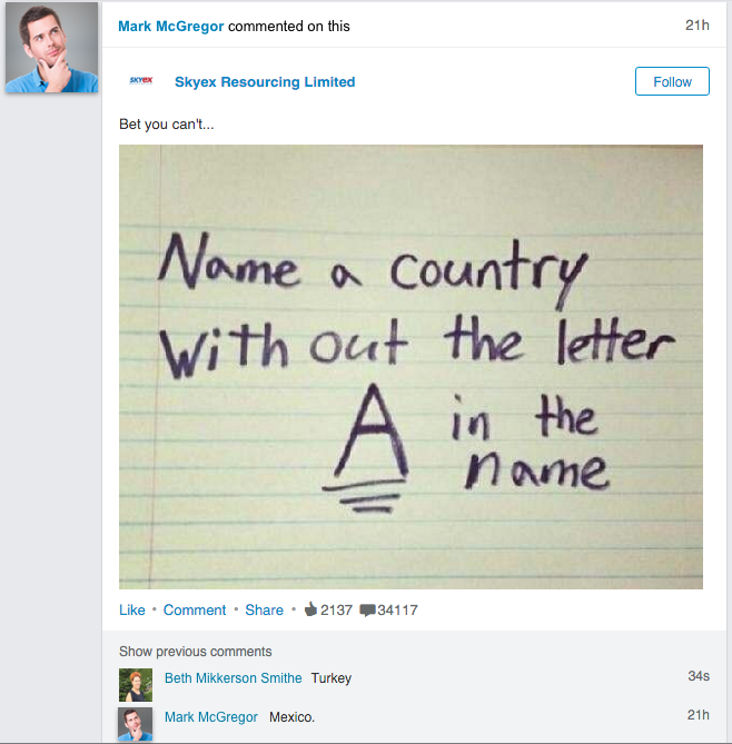 STAMFORD, CT — Mark McGregor, an advertising executive with Pushpin Media, absolutely fucking nailed his comment on a LinkedIn post earlier this week. “It was exhilarating,” McGregor said in a phone interview. “I was just sitting there scrolling through my LinkedIn feed looking for sales leads and inspirational business quotes and there it was taunting me.” The post, provided by UK-based staffing firm Skyex Resourcing, asked LinkedIn users to name a country without the letter A in its name. McGregor could not recall exactly how long it took him to figure out a name. “I kept going through so many, China, Russia, Columbia, Belarus, and I was like there is no country without an A! But then it totally hit me! Mexico! Mexico doesn’t have an A in it! I felt such a rush as a I typed it in and slammed the return key. It was way better than getting an Outperform on my performance review!” McGregor yelled. When asked if any of the previous 34,000 comments may have provided inspiration, McGregor denied it saying, “Nah man, that shit was all me. I crushed it.”